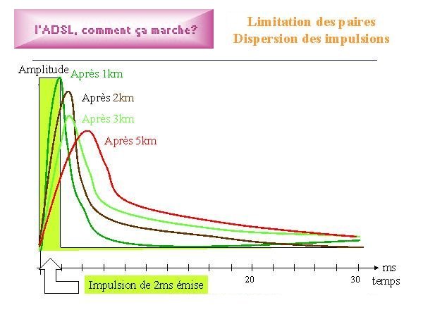 Ce diagramme montre comment on retrouve une impulsion bien carrée, au bout d'une liaison de 1 km, 2 km, 3 km et 5 km.